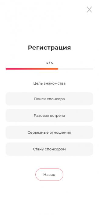 - затем при переходе на следующую страницу выбирается цель посещения сервиса (серьезные отношения, знакомства без обязательств и другое – всего доступно четыре варианта)